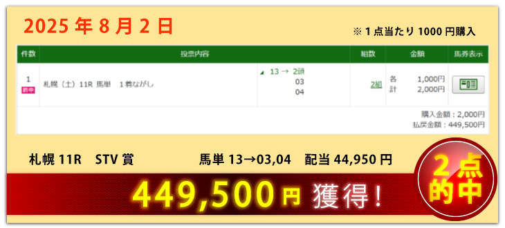 | 8月2日 | 札幌11R | 馬単13→4 | 44,950円 | 449,500円 | 的中 | |||