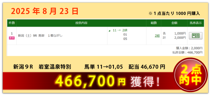 | 8月23日 | 新潟9R | 馬単11→1 | 46,670円 | 466,700円 | 的中 | |||