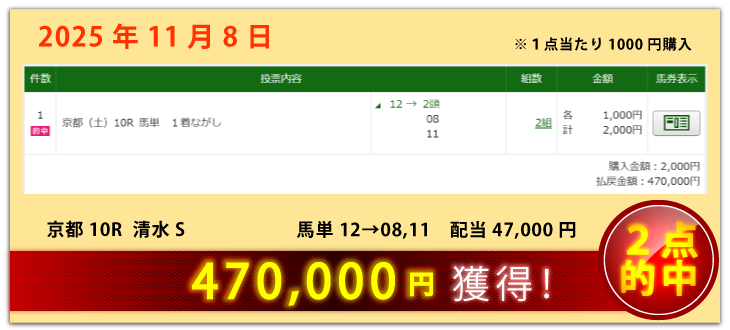 | 11月8日 | 京都10R | 馬単12→8 | 47,000円 | 470,000円 | 的中 | |||