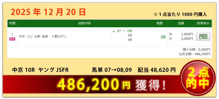 | 12月20日 | 中京10R | 馬単7→8 | 48,620円 | 486,200円 | 的中 | |||